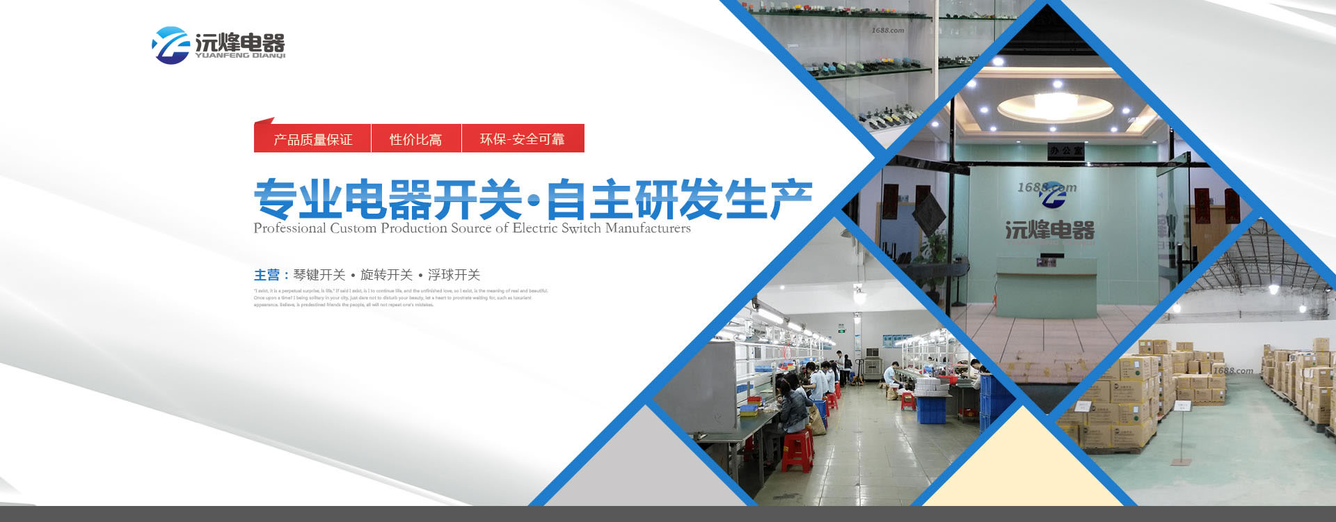 主要生產(chǎn)浮球開關(guān)、接近開關(guān)、琴鍵開關(guān)、旋轉(zhuǎn)開關(guān)、微動開關(guān)、船型開關(guān)、拉線開關(guān)以及接線座等系列產(chǎn)品。 -